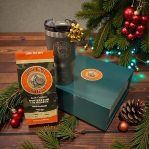 Each gift box includes a 12oz bag of fresh ground coffee- roasted here in Williamston, SC- and a ceramic lined RTIC cup to keep them (and their coffee) warm when they’re out in the field!