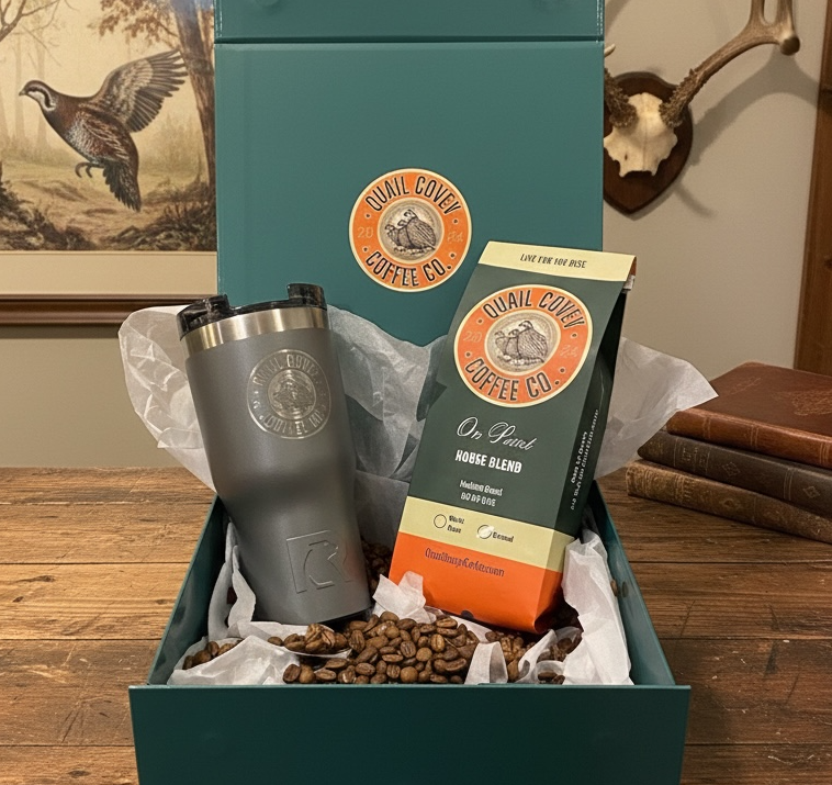 Our LIVE FOR THE RISE box is the gift that keeps on giving! A ceramic lined RTIC coffee cup keeps your coffee hot (or cold) in the field and a 12 oz bag of our fresh roasted coffee- wrapped and ready for flight! Includes a ground bag of our On Point House blend!